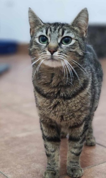 Dorosła kotka, szara pręgowana. Zbiegła we Wróblinie Głogowskim