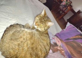 rudo-pręgowana prawie 7 letnia kotka , posiada Blizne na grzbiecie w okolicach przednich łap.