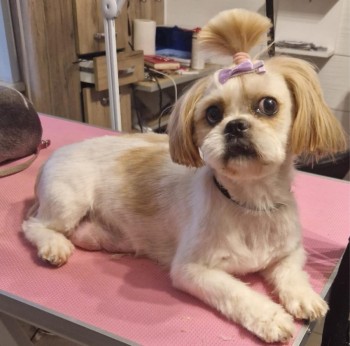 Biała suczka rasy shih tzu, w brązowe łatki. Ma dłuższe włosy na głowie, obcięta na krótko.