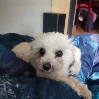 Samica rasy maltańczyk zaginęła 8.04.2024. Drobnej budowy, białe umaszczenie. Przebarwienia na sierści o kolorze żółtym.