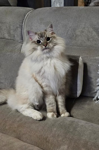 Kot rasy Ragdoll umaszczenie seal colorprint lynx RAG 0421 (długa biała sierść z szarym tygrysim pyszczkiem i przednimi łapkami, ogon ciemniejszy duże oczy) ma rok i 2 miesiące reaguje na imię Erin, często mruczy, wychowany z psami i kotem. Nie boi się innych zwierząt. Dość duży jak na swój wiek, ciekawski i towarzyski lubi towarzystwo ludzi, lubi chodzić przy nodze, mruczy jak tylko się go pogłaszcze. Lubi dużo "gadać" szczególnie głodny.