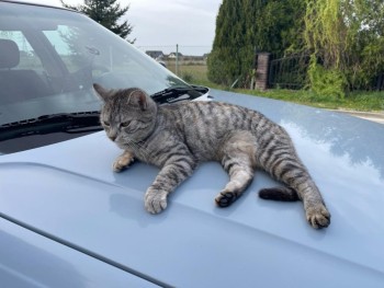 4 letnia kotka szara z prążkami i lekko rudymi nalotami. Szczupła, mała (3,5kg). Na prawej łapce przedniej ma wewnętrzny pazur z sierścią w kolorze beżowym. reaguje na gwizdanie i imię.