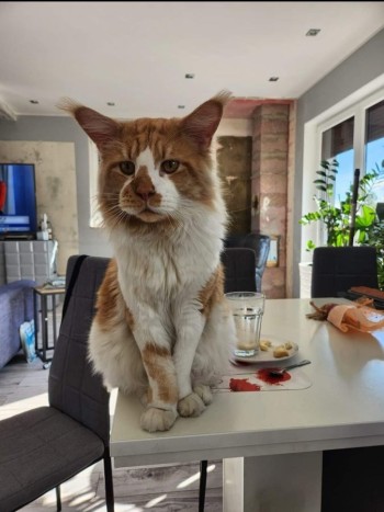 Duży kocur rasy Maine Coon o umaszczeniu rudo-białym z charakterystyczną rudą plamą na białym futerku w okolicach noska i rudymi pędzelkami na uszach. Zubi jest ufny i miziasty.