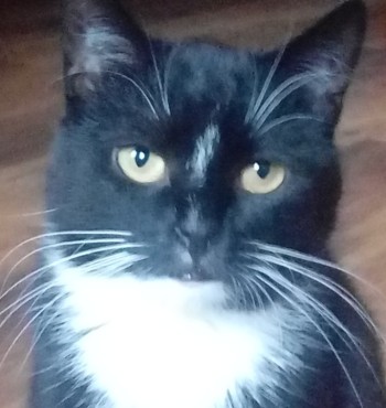 kotka, czarno biała (białe skarpetki, brzuszek i śliniak), około 7-8 lat, jest małym kotkiem