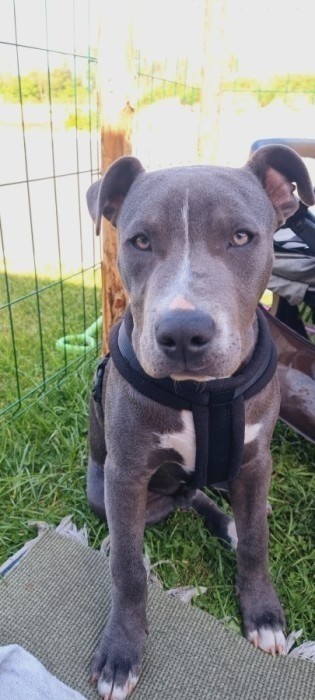 szary , podobny do amstaffa