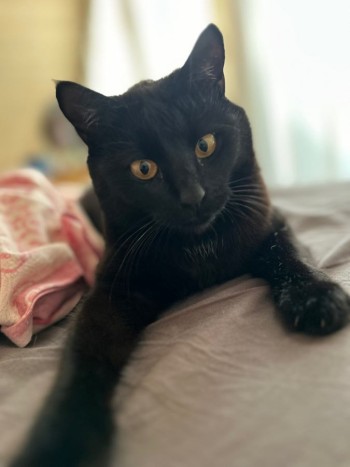 Cały czarny, ma doslownienpare bialych wloskow pod brodą: bursztynowe oczy