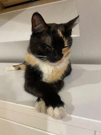 Roczna czarna kotka dachowiec z białym krawatem i łapkami