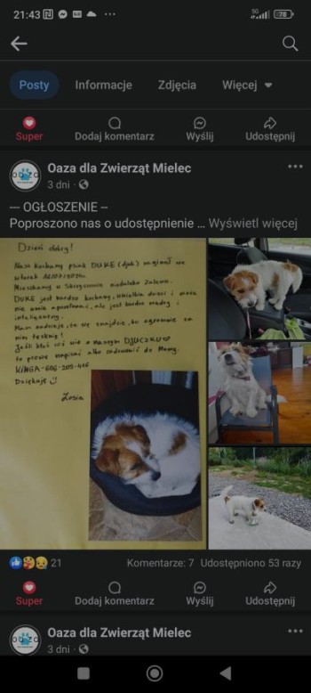 Data zaginięcia: 17/07/2024 Miejscowość: 33-156 Skrzyszów 229 Telefon: +48606205416 Numer mikroczipa: 616094501010946 Nr ID szczepienia: Płeć: Samiec Gatunek: Pies Rasa: Jack Russell Terrier