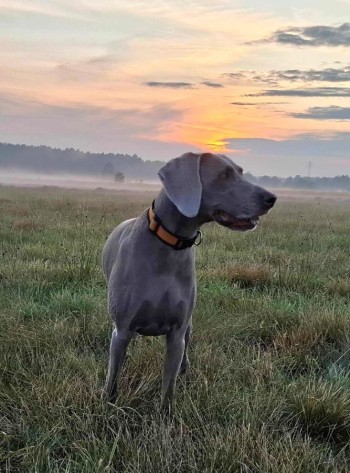 5,5 letni wyżeł weimerski. Krótka sierść o mas i srebrno-szarej. Jest wysterylizowana, nieufna wobec nieznanych ludzi.