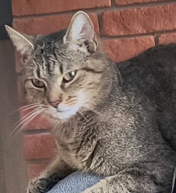 Szara, pręgowana, chuda, dwuletnia kotka Jadzia, reaguje na imię. na brodzie( dolnej wardze) ma niewielki ślad , jak była mała coś jej się wbilo w brodę.