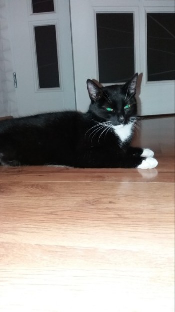 Czarna kotka ma białe "skarpetki" I białe wąsy
