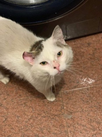 Biały kocur, kastrowany, zachipowany, po amputacji kawałka prawego ucha.