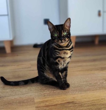 Czarno złota, rasa bengalska, zielone oczy, płochliwa. Nagroda dla znalazcy