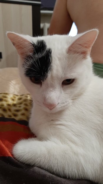 kocur wykastrowany,zaczipowany ma 4 lata, biały z czarnym ogonem i małymi łatkami na głowie boku i grzbiecie. Ma na imię Pirat ,jest płochliwy.