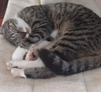 Kotka szarobura pręgowana. Łapki, podbródek białe.