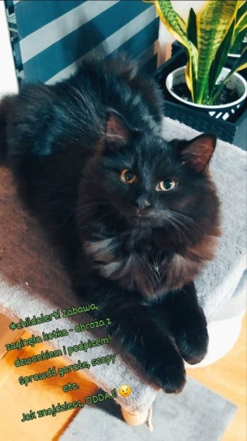 Czarna, puszysta, w typie kota syberyjskiego. Ma obroże z dzwoneczkiem, na której jest imię z numerem telefonu. Ma chip