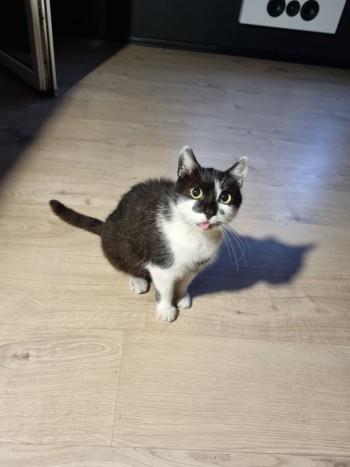 Kot czarno -biały na krótkich łapkach, brak dwóch kłów, lekko wystaje języczek, w prawym oku stale rozszerzona źrenica