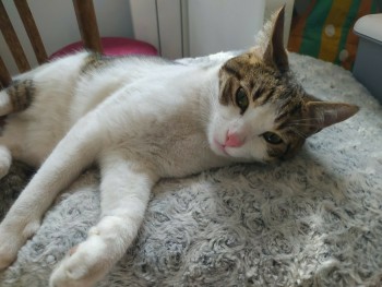 Kot buro biały z różowym nosem, białym brzuchem, białymi przednimi łapami i białą plamą na grzbiecie w kształcie nietoperza oraz białą końcówką ogonka, ma duże oczy