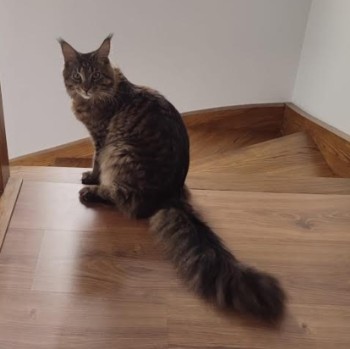 szary w paski, ma puszysty ogon i uszy jak ryś