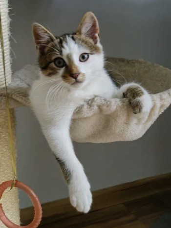 Felek - kocurek dziewięciomiesięczny ( 05.03.2024 r. ), biało - buro - brązowy, sierść krótka, cechą charakterystyczną jest czarna kropka w kąciku powieki wewnętrznej strony lewego oka, 3 łapki dwu kolorowe : czarno - czerwone, ma cienki głos, miauczy naturalnie jedynie w stanie zagrożenia, natomiast poza tym stanem wydobywa z siebie dźwięki na zasadzie " aaaaaaaa" .... Jest zachipowany.