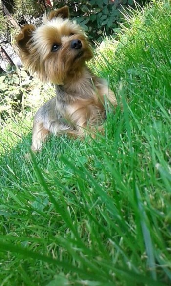 Pies koloru stalowo-złotego z bardzo krótkim ogonkiem,wiek trzy lata ,krótko obcięty.