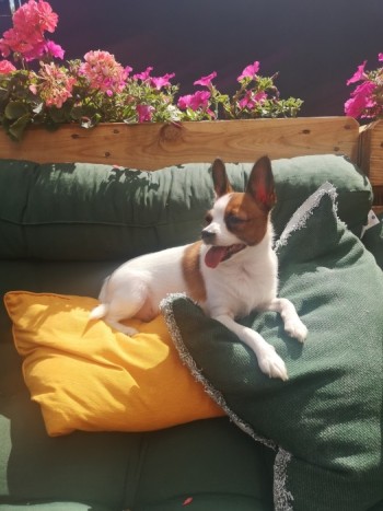 Mała biała suczka, typu ratler,sarenka,posiada 3 charaktrystyczne okrągłe ciemne rude łatki przy pyszczku też ma ciemny 2 łatki na oczach jak panda razem z uszami .duże odstające uszy jak u królika