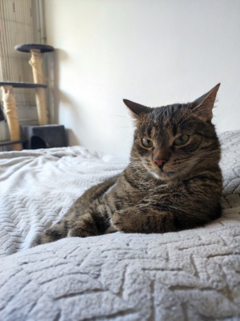 Bury kot z lekko puszystą sierścią. Łasi się do każdego:)