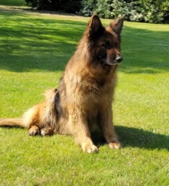 Owczarek niemiecki długowłosy, czarny podpalany, suka, łagodna