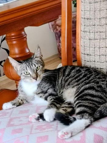Umaszczenie marmurkowe. Młody kot, białe łapki. Imię Tiki. Zaginął 29.04.2025 ok godziny 18:00 w Tomaszowie Mazowieckim w okolicy ulic Legionów i Malinowej.