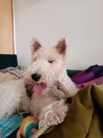 Pies 4 lata foksterier szorstkowłosy trikolor czerwona obroża