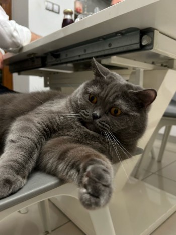 Leonek, kocur rasy brytyjskiej krótkowłosej, o szaroniebieskim futerku i bursztynowych oczach. Przyjazny, ale może być ostrożny wobec obcych