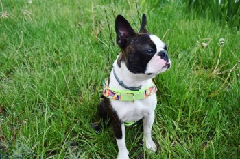 Mały Boston terrier, nieufny. Może uciekać, choruje na niedoczynność tarczycy i serce. Wykastrowany.