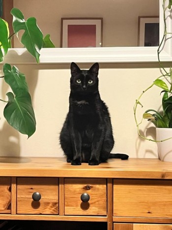 Samiec czarnej maści, biały mały krawacik, zielone oczy,