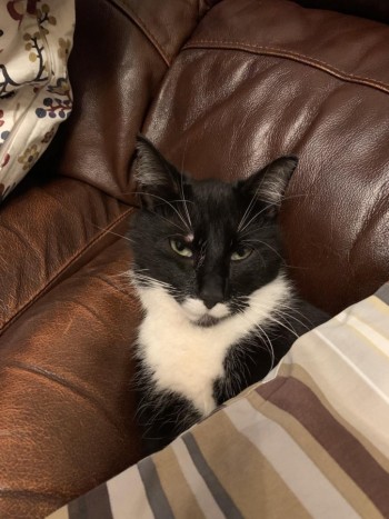 Wiek 3 lata. Kocurek. Czarny białe górne wargi i dolna prawa. Biały przód od szyi po brzuch oraz białe wszystkie końce łapek. Potrafi otwierać drzwi wskakując na klamkę.