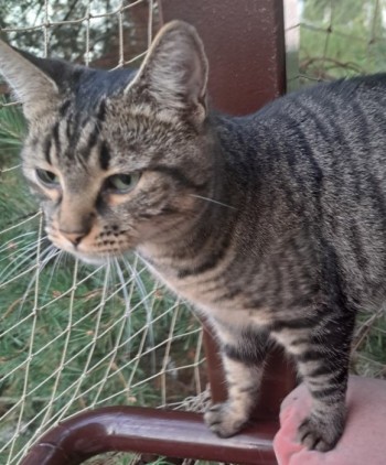 od spodu czarne łapki, brzuszek w cętki, rudawe kolory, szaro czarna
