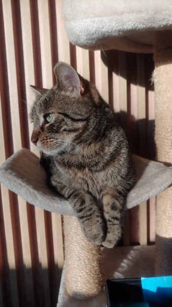 Simba to niewielki dachowiec szary w prążki. Ma zielone oczy i złamany ogonek, lekko przyjęty.