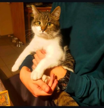 Kot, plus minus roczny buro-biały, puszysty, wykastrowany, dość duży.