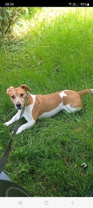 Pies w typie jack russel terrier jednak jest chyba pomieszany z jamnikiem - ciut dłuższy. 10kg wagi, 4 letni piesek, wykastrowany. Rudo- biały, łepek cały rudy z odbarwieniem w kształcie plamek na nosie po silnej alergii. Ogon trochę opadający w dół.