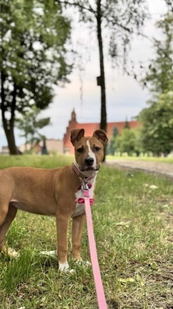 Ruda pół roczna suczka rasy Amstaff, cztery białe skarpetki, biały krawat oraz biała plama na pół nosa