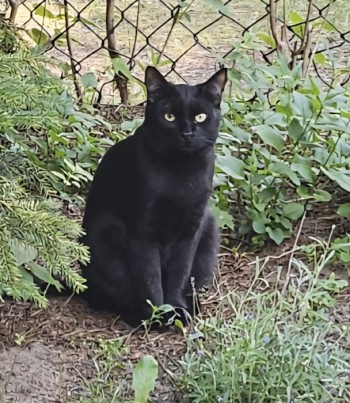 Jest cały czarny, wykastrowany, ma żółte oczy