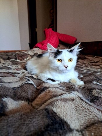 Biały kocurek z domieszką czarnego, półdługi włos.