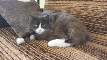 12 letni, kastrowany kocur syberyjski, długowłosy maści szarej z białym pyszczkiem i skarpetkami
