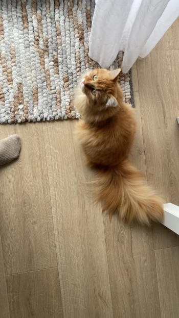 Roczna kotka, umaszczenie ruda z białym, rasa Norweski Leśny.