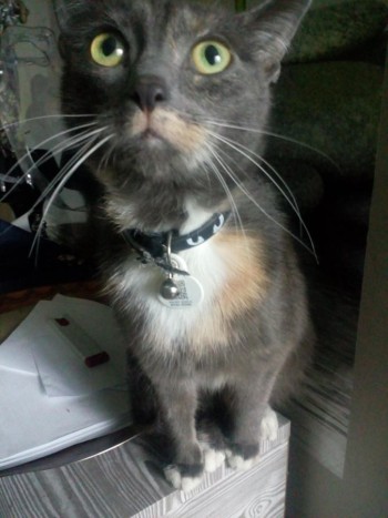 2-letnia kotka po sterylizacji, szara z białym podgardlem i końcówkami tylnich łapek, gdzieniegdzie kawowe plamki. Założona czarna obróżka z białymi oczkami z dzwoneczkiem i przywieszką z kodem QR. Zaczipowana. Dzielnica Dańdówka.