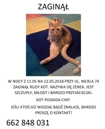 Data zaginięcia: 11/05/2018 Miejscowość: Bytom Telefon: 662848031 Numer mikroczipa: 616093900433601 Nr ID szczepienia: Płeć: Samiec Gatunek: Kot Rasa: europejski
