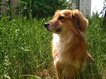 Średniej wielkości piesek o długim rudym włosie. Nieufny