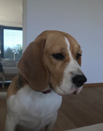 Beagle tricolor (biało-czarno-brązowy). Suczka sterylizowana. 3,5 roku. Z charakterystyczną białą łatką na grzbiecie. Reaguje na imię Nutella.