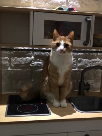 Rudy z białymi łapkami 4-letni kocurek, charakterystyczna cecha:brak górnego kła. Zaczipowany. Zaginął na działce około 28.04.2019