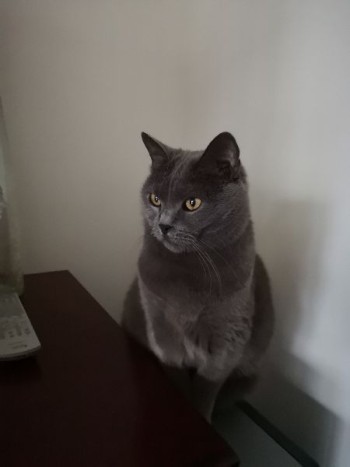 Niebieski, dość otyły, 10 letni kocur ze złotymi oczami. Na szyi obroża w jagody i tabliczka informacyjna. Niezbyt ufny