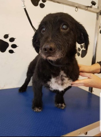 Snoopy, mały czarny piesek z białą łatką i bródką, ślepy i głuchy, chudej budowy, krótka sierść, starszy 13 lat, klapnięte uszy, długi i prosty ogon, wytarte futro przy nosie.